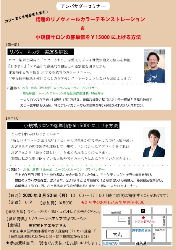 【3/30(京都)セミナー】リノヴィールカラー実演・解説&小規模サロンが客単価を¥15000に上げる方法