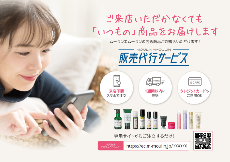ムーランエムーラン販売代行サービスは、ヘアケアミニなどのサンプルを渡したり、仕上げに使用したアイテムを、「よかったらこちらから買えるようになっています」と専用のURL(QRコード※)をご案内するだけ。お客さまはネット通販のようにご注文いただき、商品はムーランエムーランからお送りいたします。