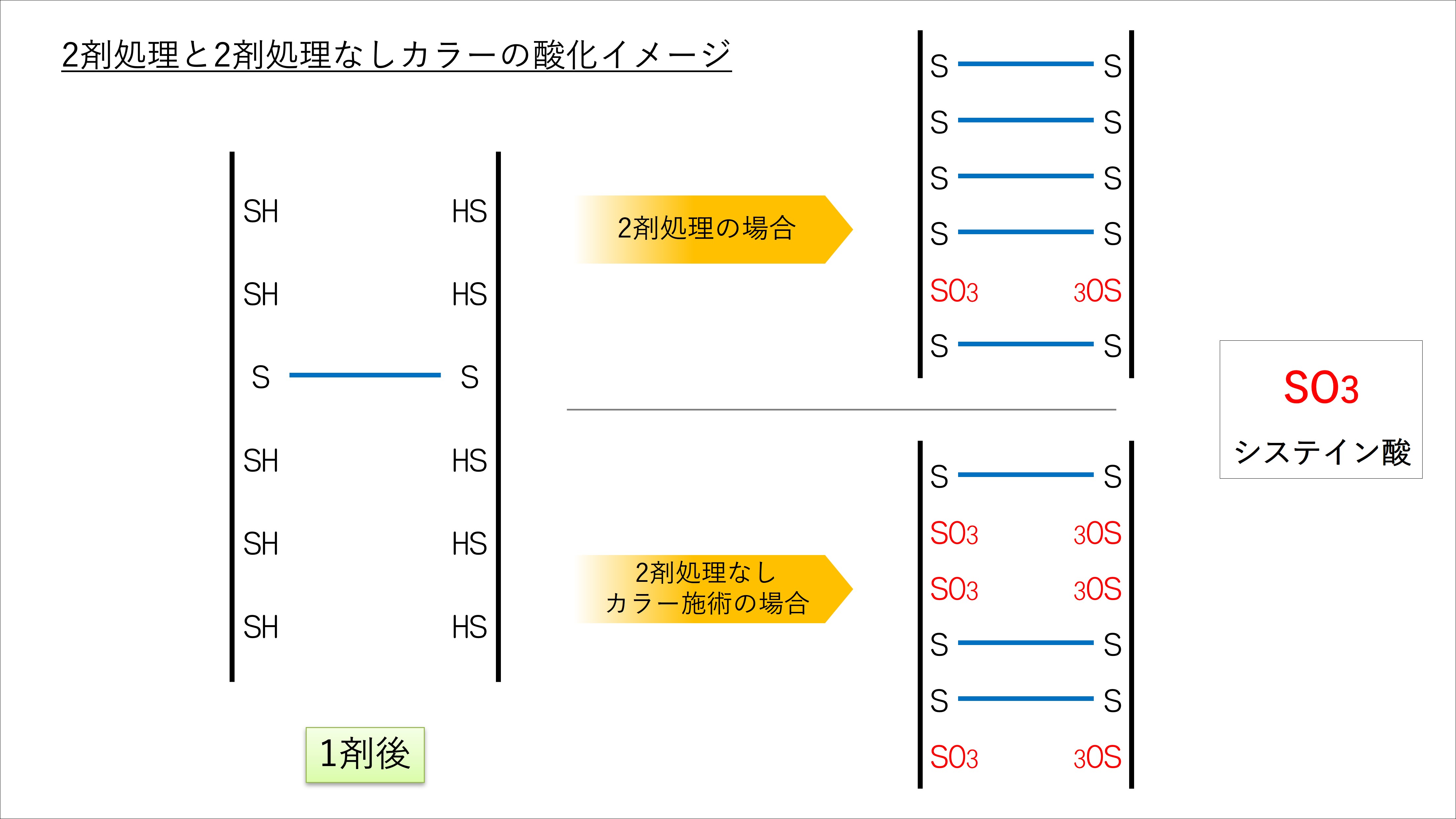 そのためヘアカラー剤ひとつで、SS再結合とカラーリングが同時にできると考えるわけですね。