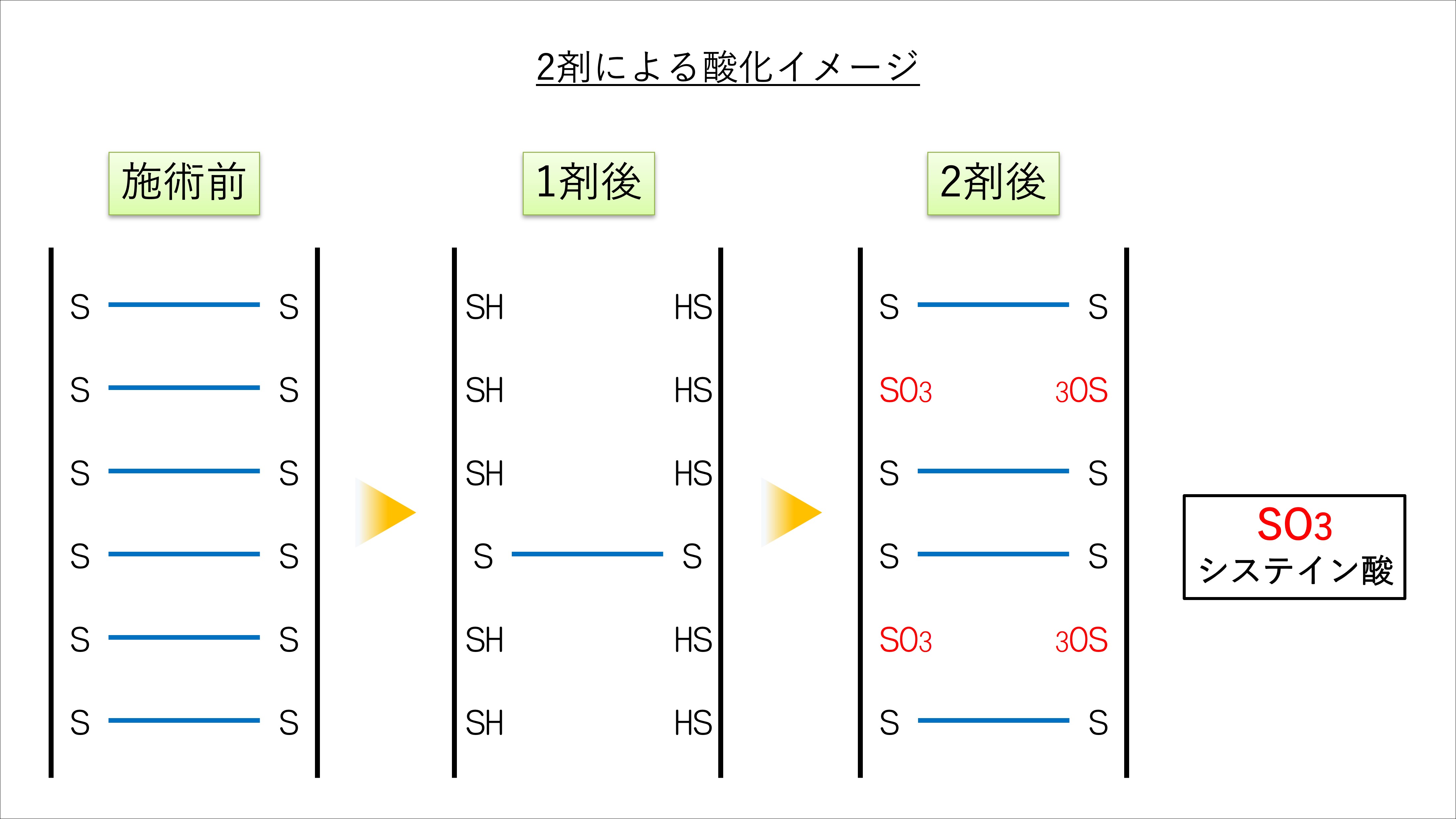例えば、1剤で10箇所のSS結合が切れたとして、2剤で再結合できるのは7~8箇所ほどしかなく、残りの2~3箇所はシステイン酸に変化し、SS結合の総数は縮毛矯正やパーマを行うたびに減少していきます。