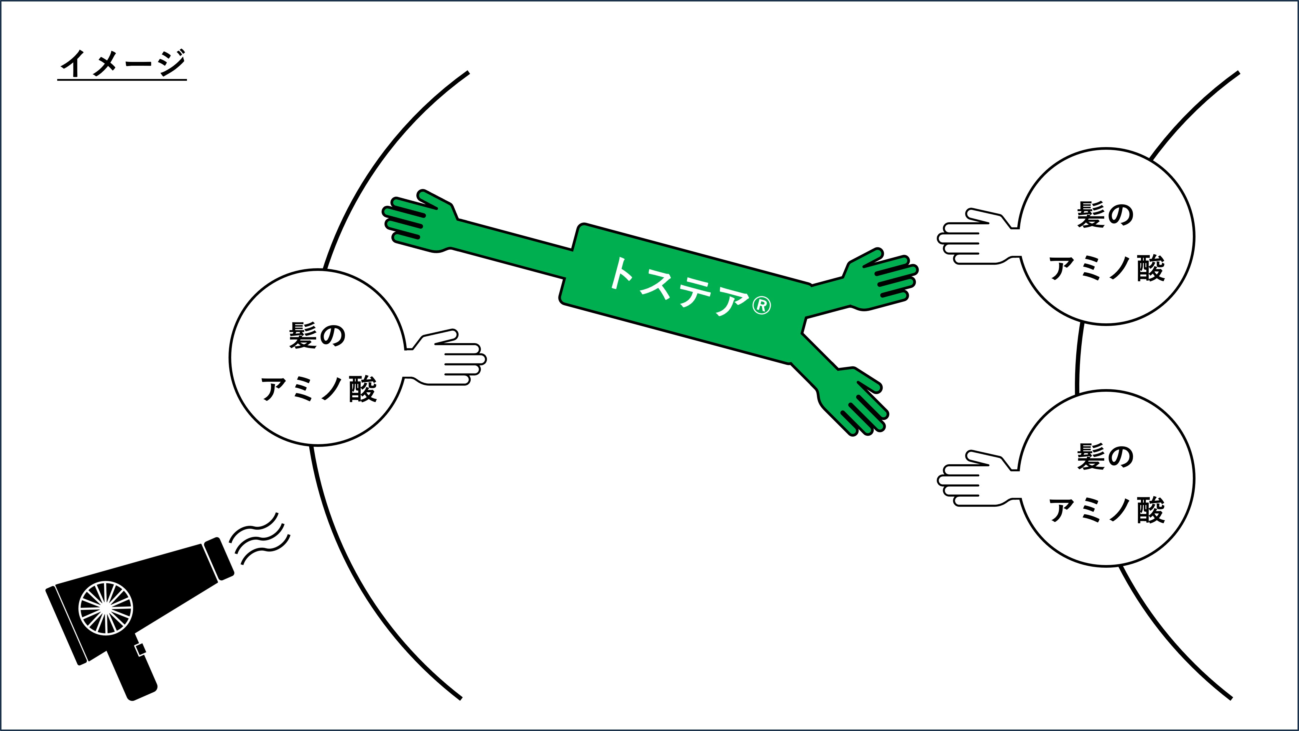 トステア®以外にも、いわゆる架橋成分と呼ばれるものはありますが、それらの多くは分子構造的に「手が2つ」なのに対し、トステア®は「短い手2つと、長い手1つ」の「3つの手」を持っており、手の多さや架橋に適した長さのバランスによって、しっかりと架橋、補強し毛髪強度を高めます。(※ここでの「手」とは官能基のこと)