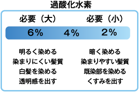 過酸化水素は「ブリーチ」と「発色」の役割をします。求める仕上がりの状態に合わせて過酸化水素濃度を使い分けましょう。