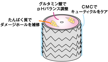 アルカリの「キューティクルを開く」という作用は、髪のpHを高くすることで髪の中の結合が切れ、膨らむことで起こります。この結合が切れている状態は髪が軟化しており、キューティクルは開いたままで髪がやわらかい状態なので、キューティクルが剥がれたり、隙間から内部成分が流れ出たりします。その結果、パサつきやザラツキなどが起こってしまいます。