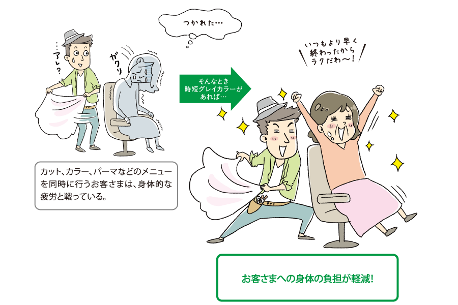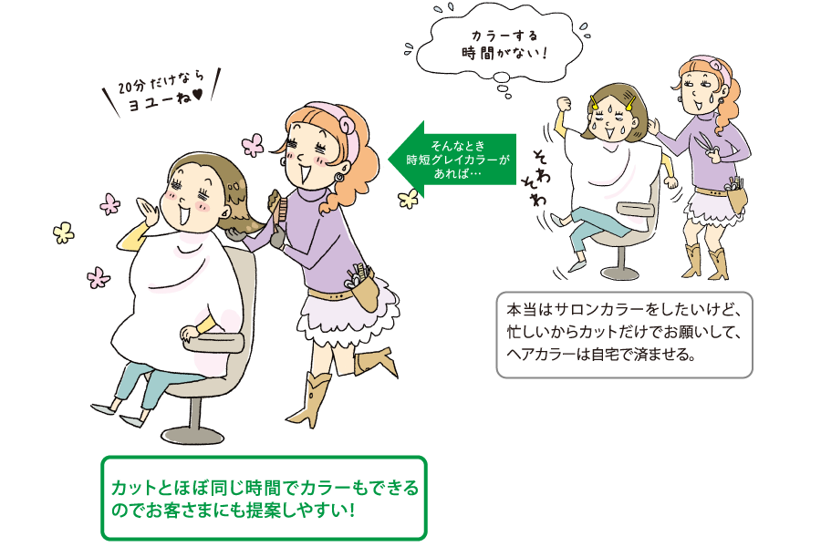 お役立ちコラム 【お客さま満足度&回転率UP】時短グレイカラーの2大活用 2016/09/28 お客さま・業界情報 時短グレイカラーのメリットって何?そんな疑問にお答えします! メリット①年配客の負担軽減!「楽になった」と喜ばれる! メリット②カットのみのお客さまに、カラーが提案できる! Tag: お客さま提案グレイカラー戦略