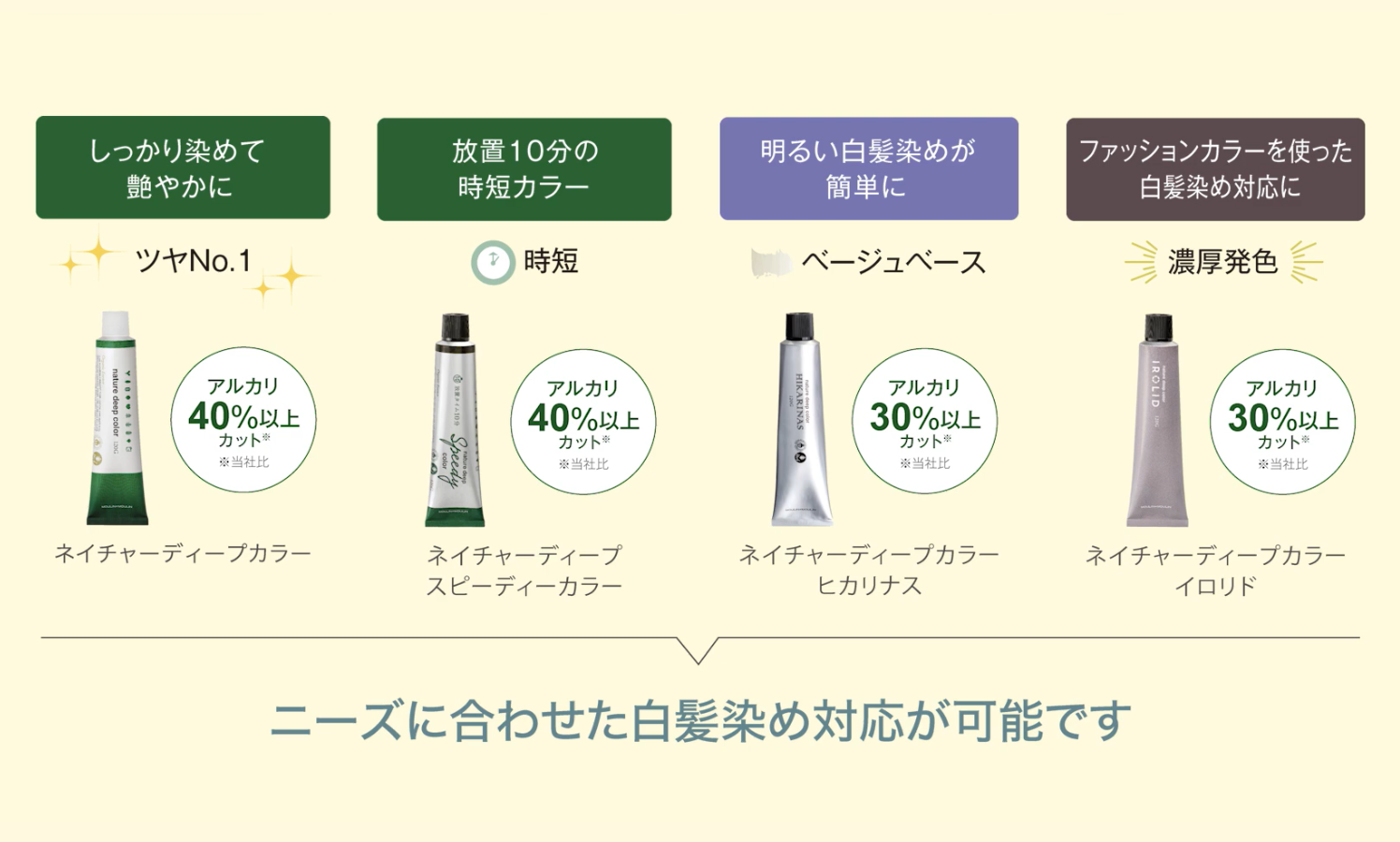 今月の特集1つ目は、低アルカリカラー※のネイチャーディープカラーシリーズでニーズに合わせた白髪染め対応についてご紹介♪それぞれお得に試せるトライアルセットがございます♪※当社比