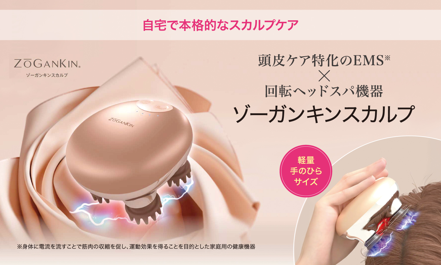 頭皮ケアに特化したEMS※とパワフルな回転ヘッドで筋肉をほぐす、ホームケア用美容機器「ゾーガンキンスカルプ」。