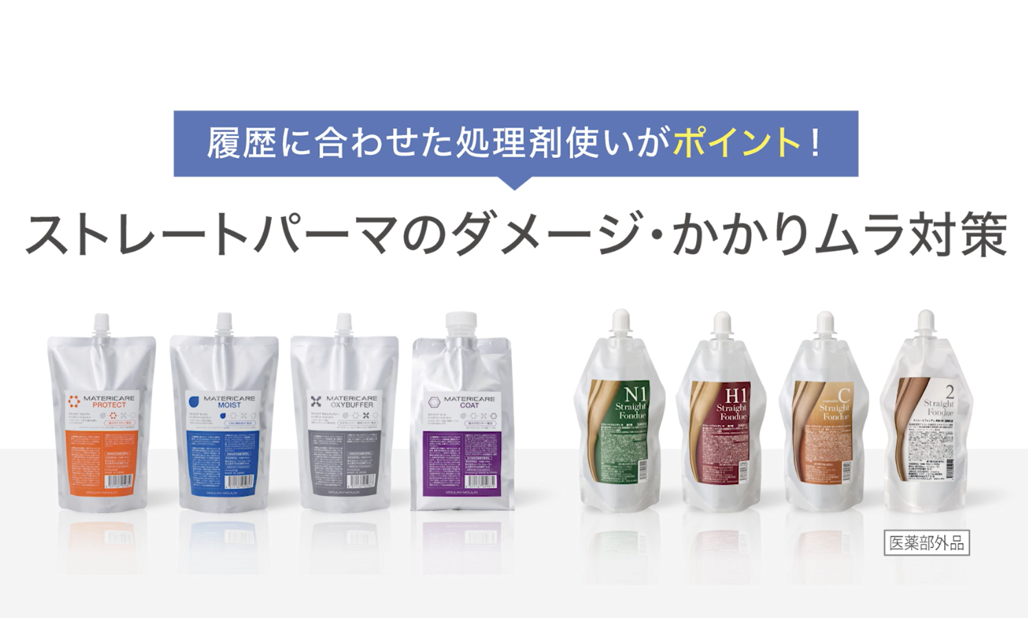 ストレートパーマのダメージ・かかりムラ対策に、処理剤シリーズ「マテリケア」の活用事例をご紹介いたします。