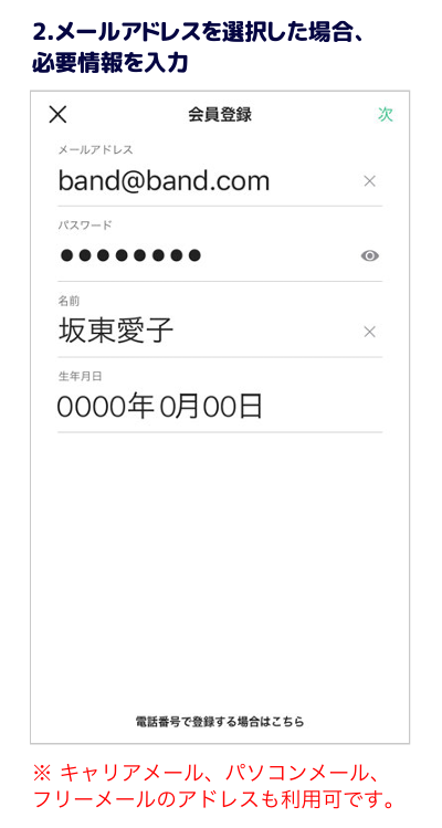 ※スマホからご利用は、BANDアプリのダウンロードが必要になります。