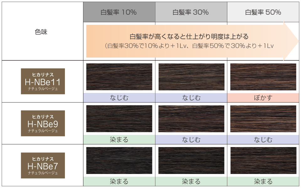 ヒカリナスは基本白髪率10%で白髪が染まる設計になっていますが、白髪率が高い場合は明度を選定いただくことで調整できます。色味やお客さまの髪質によっても違いはありますが、おおよその目安は下記のとおりです。