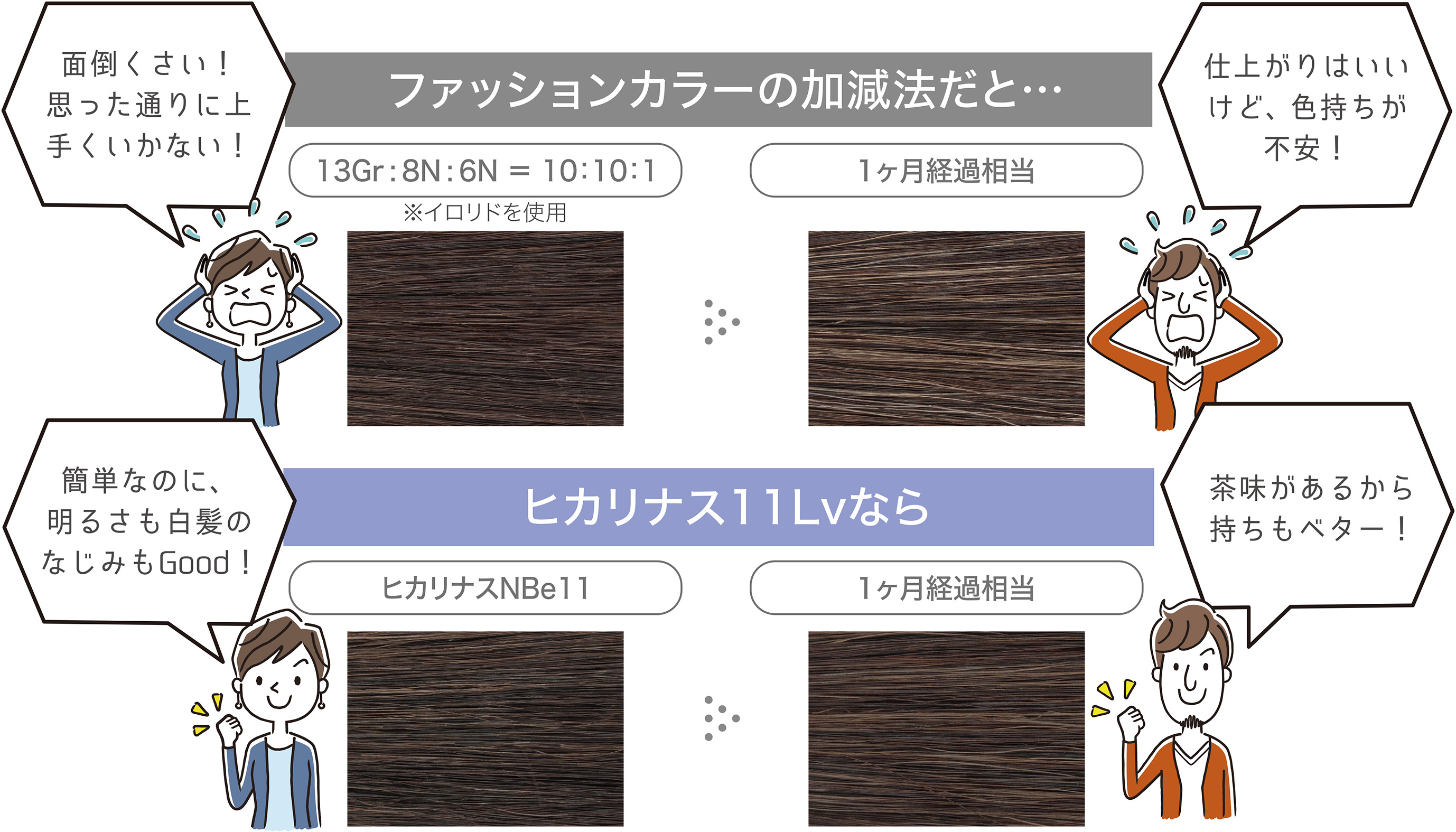ヒカリナスは通常のグレイカラーと違い、ベージュベースの色味のファッショングレイカラー。