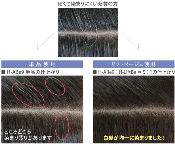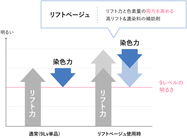 リフトベージュはリフト力と色素量を両方高めることで、明度を維持しながら白髪の染まりを高める専用コントールカラー(染まり補助剤)です。