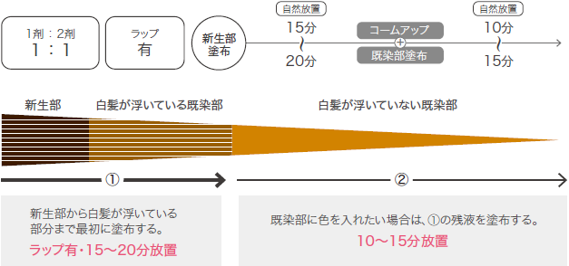 既染部の発色を高めたい場合は、①新生部塗布後5~10分放置した後、②既染部に薬剤を塗布し、20~25分放置して下さい。