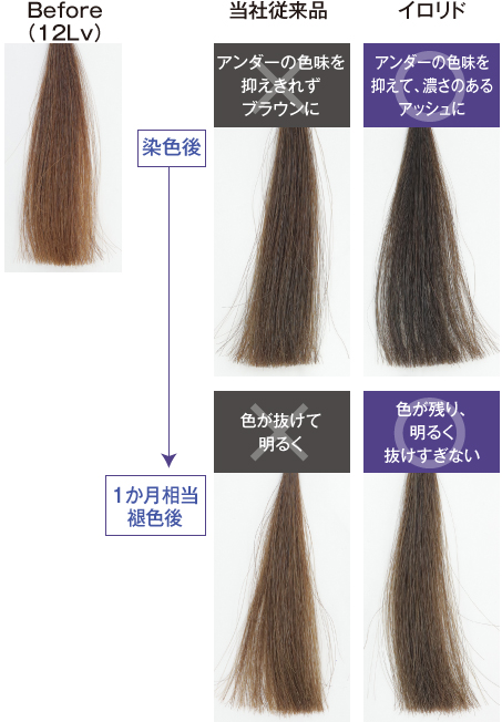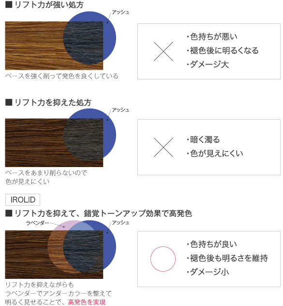 リフト力は抑え、色の濃さで発色させることで、明るくなりすぎずに色味が残ります。
