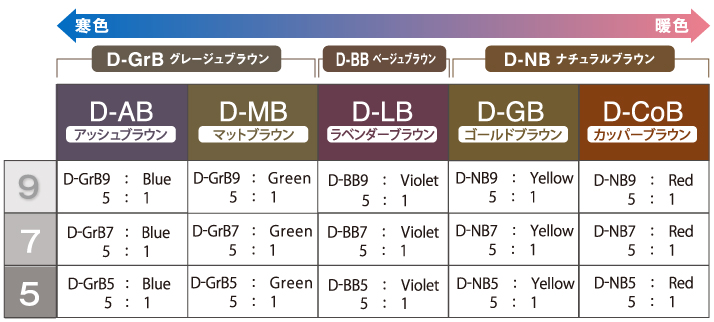 →1Lv明るく調整、もしくはD-NBよりもやわらかな色味で染まるD-BBを選択してください。