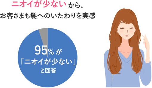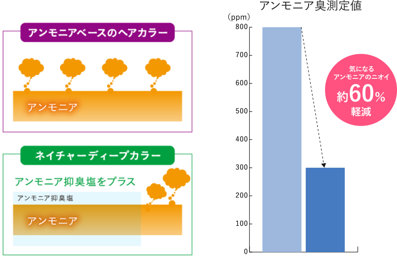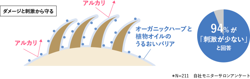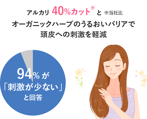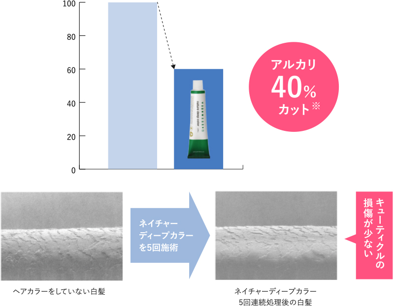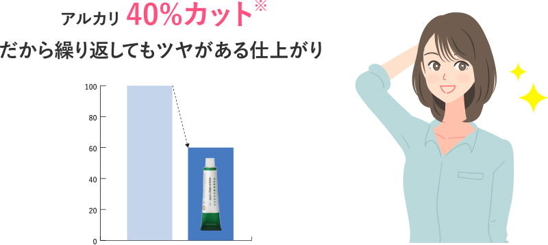 ダメージの原因となるアルカリを40%カットして、キューティクルへの負担を軽減するから、毎月繰り返し染めるお客さまでも、美しいツヤが維持できます。 ※当社比