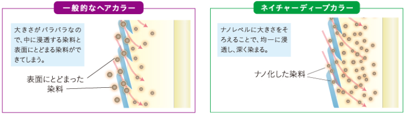 ナノレベルの染料を、自然由来の浸透成分「バイオBG*」で深く浸透させ、白髪を深く染めあげます。キューティクルを開きすぎないから、褪色が少ない。※1.3-ブチレングリコール(保湿成分)