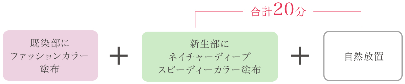 新生部に薬剤を塗布して自然放置した後、根元の薬剤をコーミングで伸ばして合計20分程度で仕上げます。