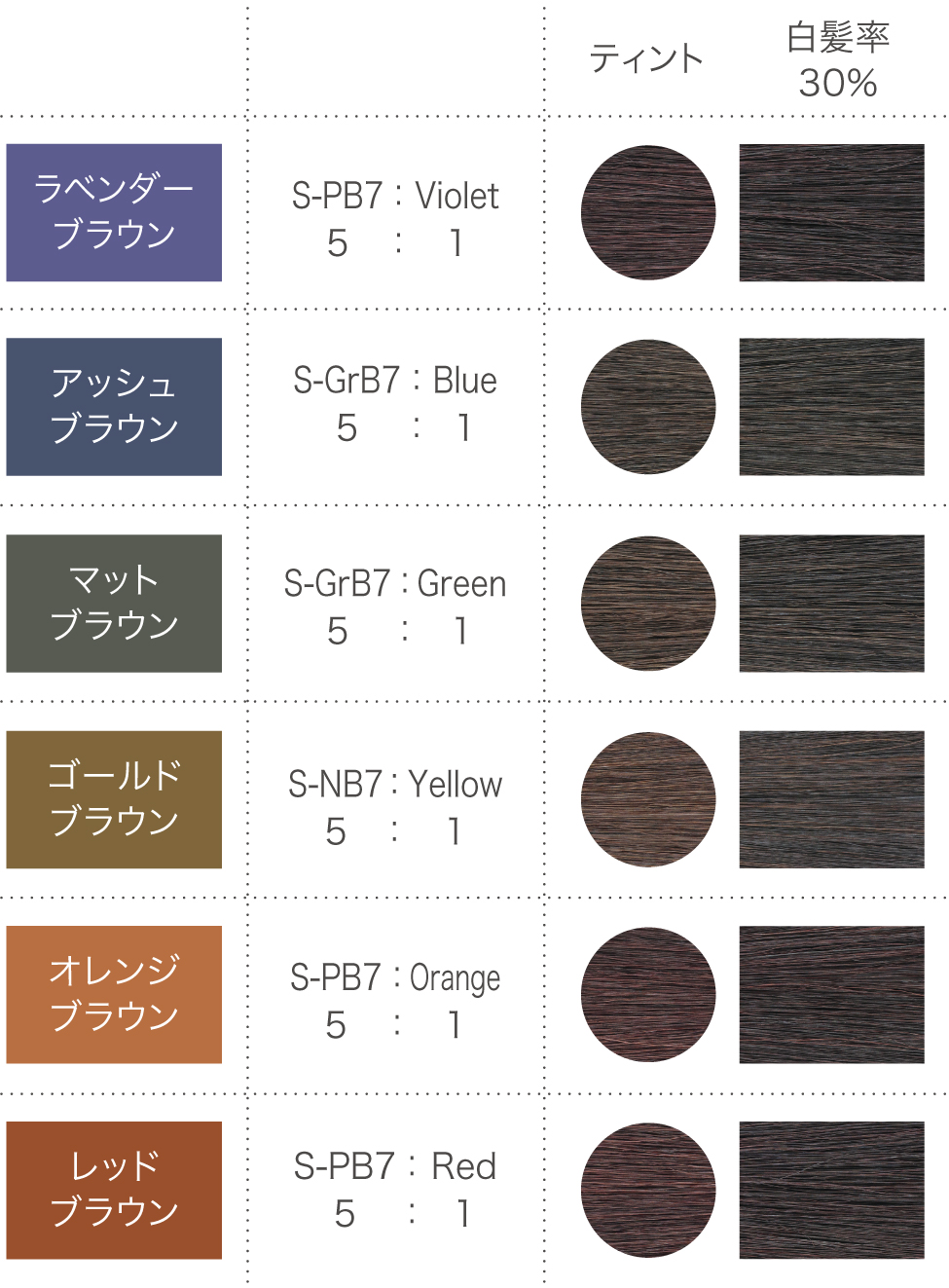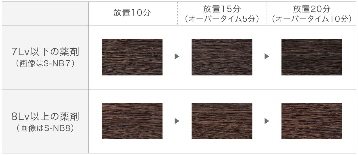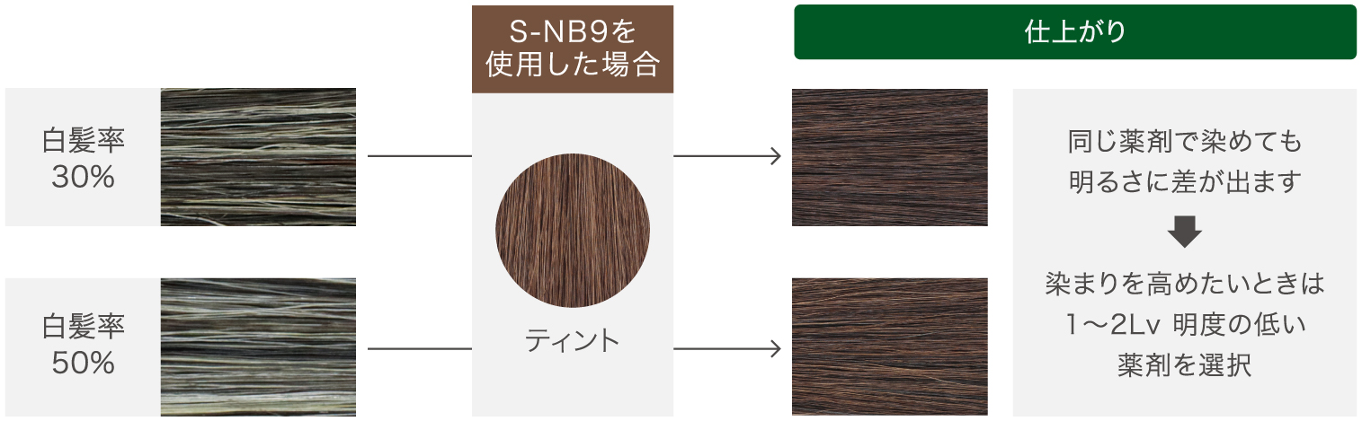 白髪率によって、仕上がり明度や染まり具合が変わります。同じ薬剤で染めても明るさに差が出ますので、染まりのご要望にあわせて薬剤の明度を選定してください。