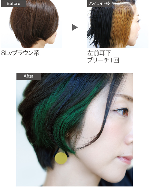 Grayをミックスすることでブリーチしたベースの黄味によらない深いグリーンに。