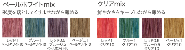 色の三原色(レッド、イエロー、ブルー)を使って、絵の具感覚で色を作り、そこに彩度調整のグレイとベージュ、色を薄めるクリアとホワイトでバリエーションを広げられます。