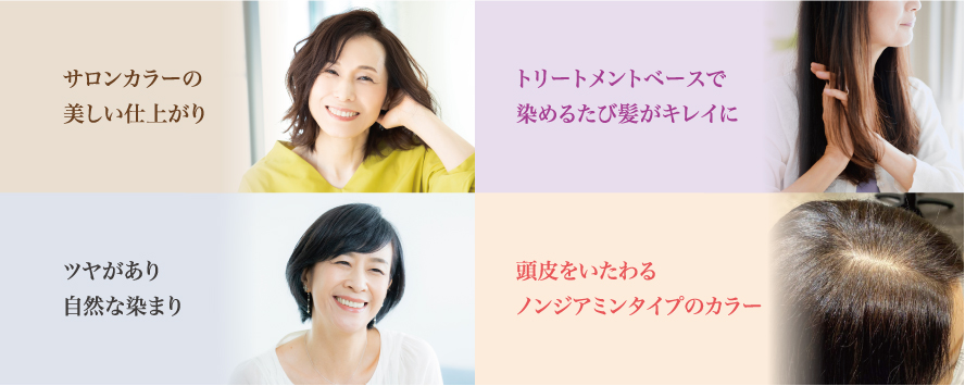 塩基性・HC染料の課題である白髪の染まりを高め、納得の仕上がりに。新しい白髪染め提案にご活用いただけます。