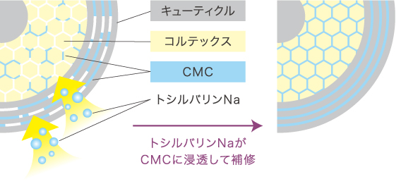 コルテックスやキューティクルの間に存在するCMCを補修して、髪のハリ・コシをアップ。