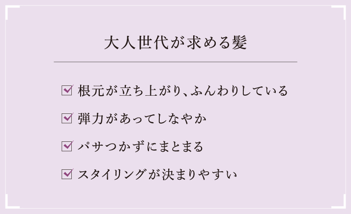 大人髪のハリ・コシ、ボリュームをケアしながら、まとまりやすい髪に。