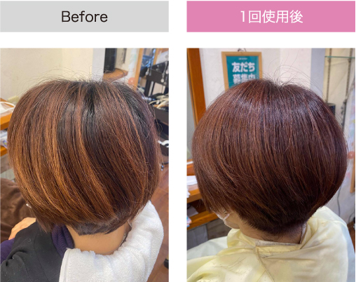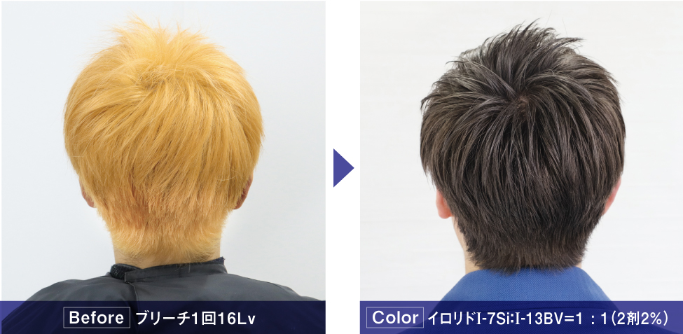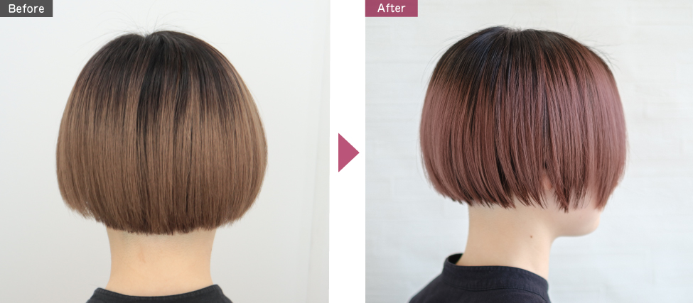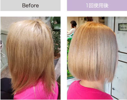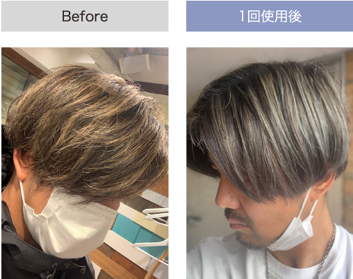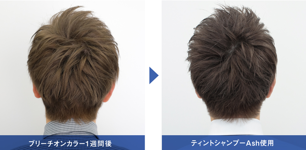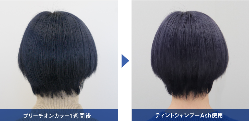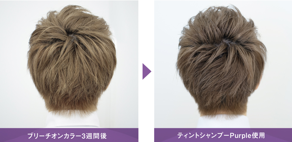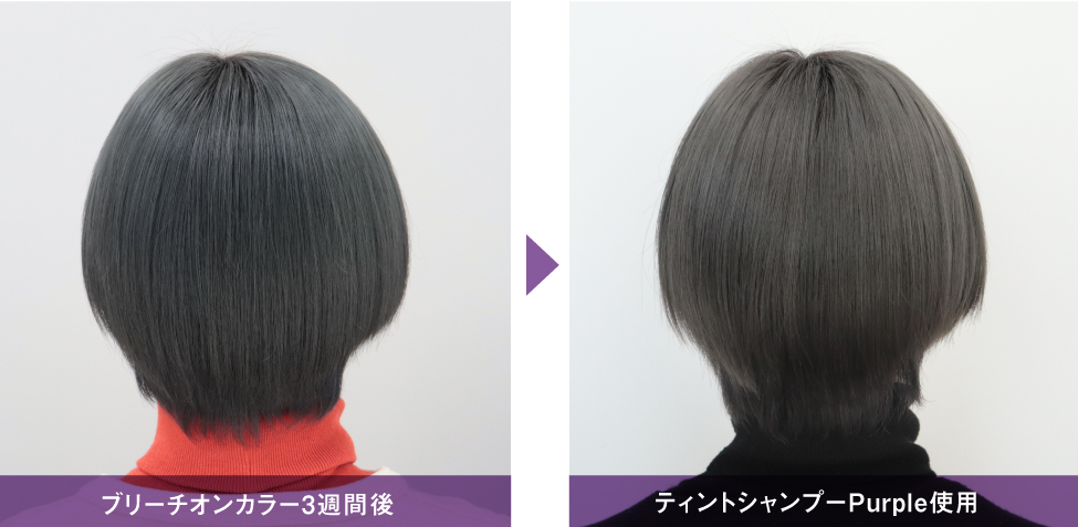 カラーシャンプーを使うことで、黄味が強くなるだけの褪色過程ではなく、ホワイト寄りのブリーチヘアーへの褪色過程を楽しんでいただけます。