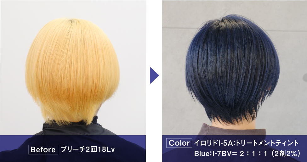 青味が抜けた後はマットぶれが気になるブルーブラック。カラーシャンプーでブルーブラックからグレージュへの褪色過程を楽しんでいただけます。