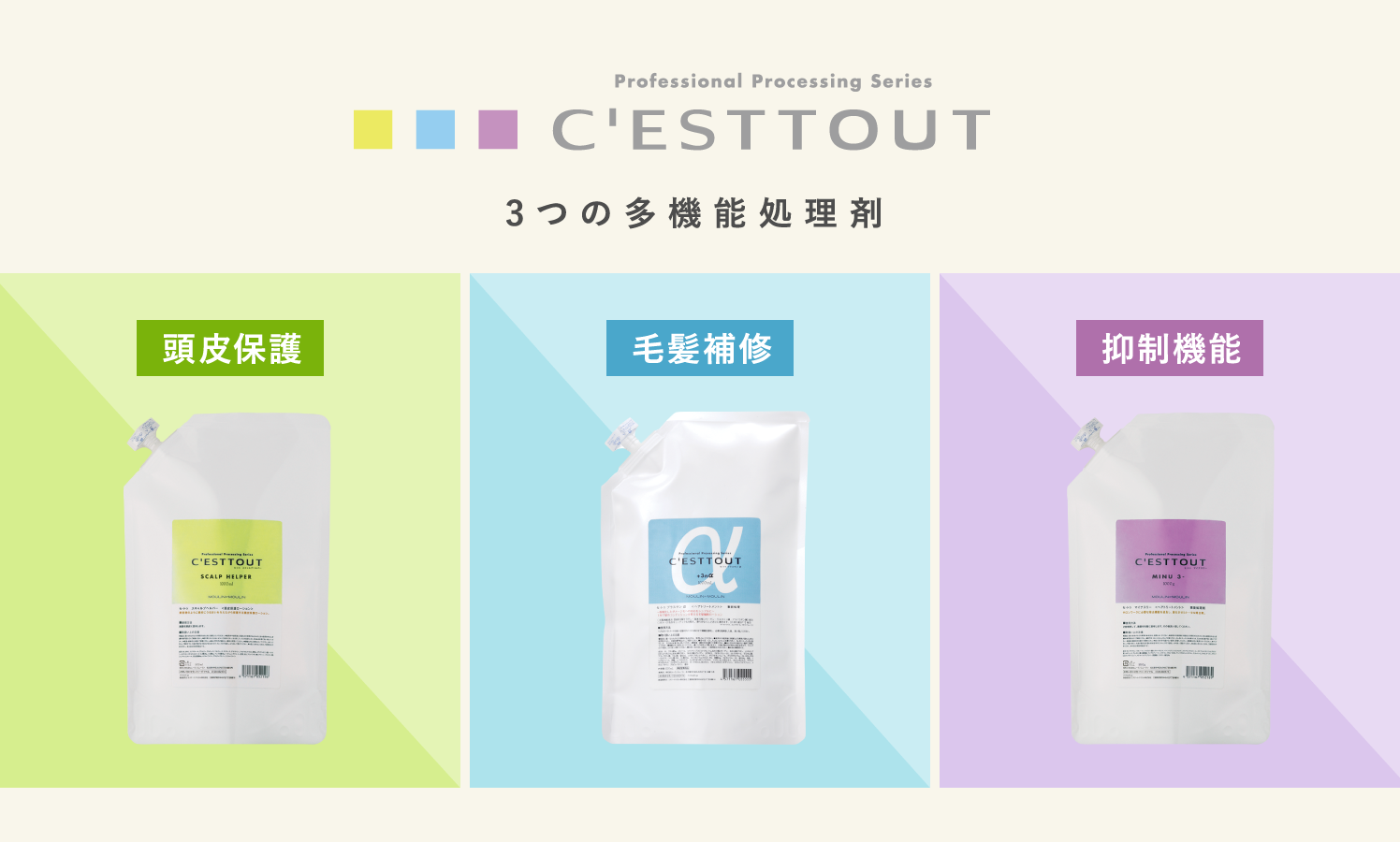 事前・中間・事後処理などにもオールマイティーに使える※ヒドロキシプロピルトリモニウム加水分解コラーゲン、加水分解ケラチン、ヒドロキシプロピルトリモニウム加水分解ケラチン(羊毛)、加水分解コラーゲン、グルタミン酸、アスパラギン酸、セラミド2、コレステロール、クオタニウム-33(全て毛髪補修成分)