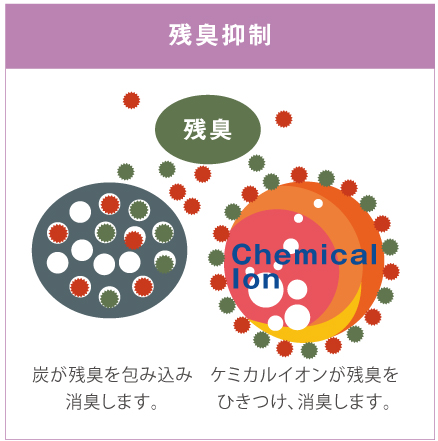 炭の脱臭効果に注目。炭の表面にある細かい穴が残臭を吸着します。また、毛髪内部にある悪臭成分の分子と化学的に結合するケミカルイオンを採用し、ダブル効果で施術後の臭いを軽減します。
