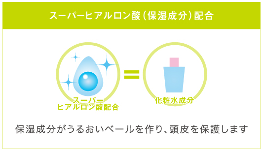 スキンケアで使われているスーパーヒアルロン酸・ポリグルタミン酸を中心にした保湿成分を採用。うるおい皮膜を作り出すことで、頭皮への刺激と乾燥を緩和します。