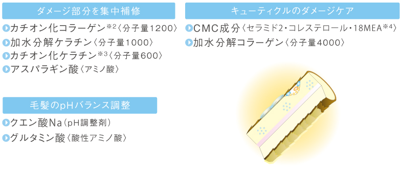 ※1 ヒドロキシプロピルトリモニウム加水分解コラーゲン、加水分解ケラチン、ヒドロキシプロピルトリモニウム加水分解ケラチン(羊毛)、加水分解コラーゲン、グルタミン酸、アスパラギン酸、セラミド2、コレステロール、クオタニウム-33(全て毛髪補修成分)