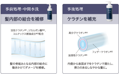事前処理と仕上げのトリートメントとして使える事後処理、そしてホームケアがセットになったシリーズです。