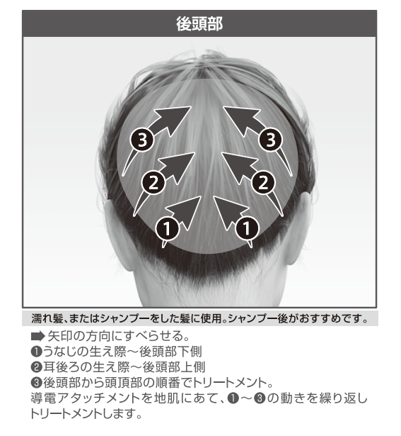 頭皮:入浴中のシャンプー前後の水やお湯で濡れた状態。 または、スカルプケア用品などで十分に濡らしてください。