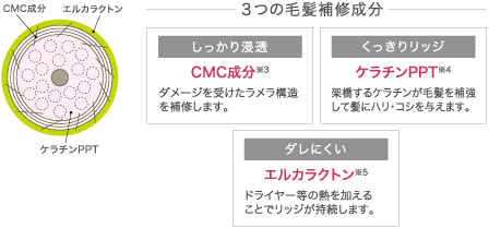 ※3セラミドNG、ラウロイルグルタミン酸ジ(フィトステリル/オクチルドデシル)、(メタクリル酸グリセリルアミドエチル/メタクリル酸ステアリル)コポリマー ※4加水分解ケラチン(羊毛) ※5γ-ドコサラクトン(全て毛髪補修成分)