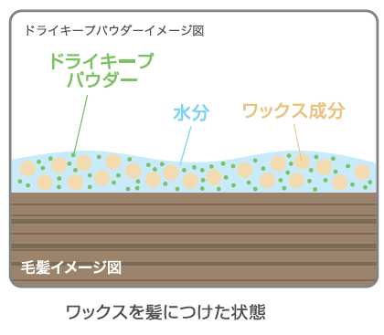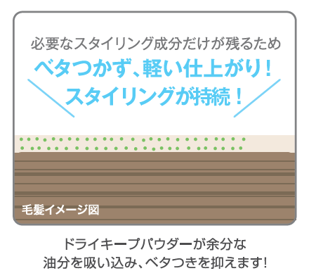 吸水性・吸油性の高い、微細な粉末である「ドライキープパウダー」を配合しました(表示名称:シリカ)。このパウダーは、余分な油分を吸い込んでくれるため髪に重さを残しません。そのため、「ベタつかない仕上がり」「立ち上げ、束感が持続」という特長が可能となりました。また、このパウダーは空気を取り込みやすいという性質を持っているため、軽さや空気感のあるスタイルを表現しやすい特長もあります。
