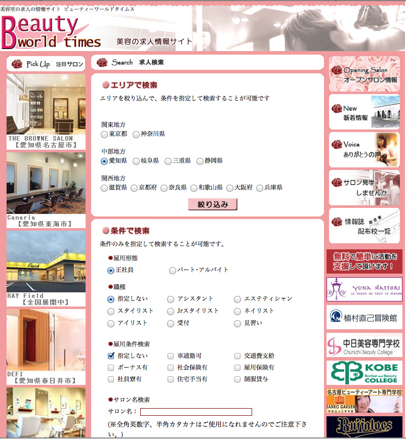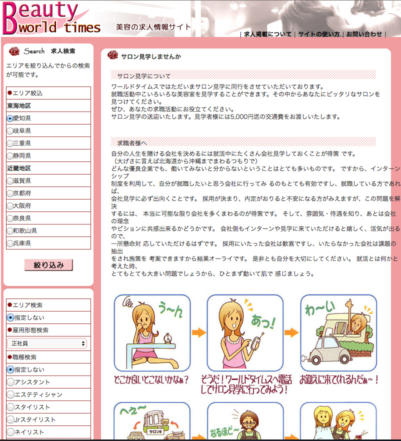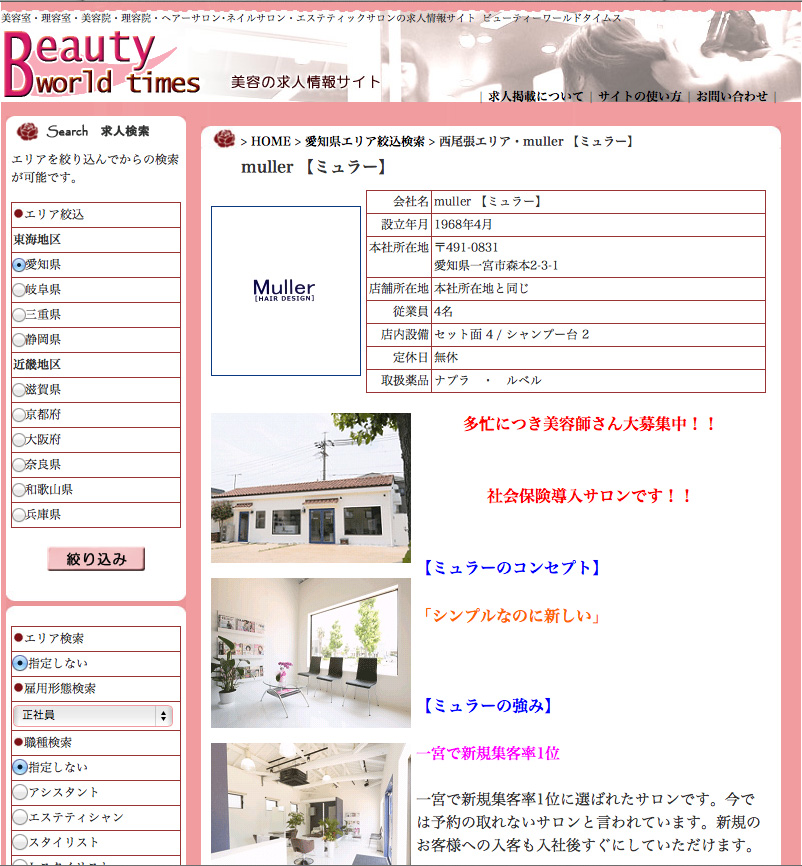 ビューティーワールドタイムスは、従来の雑誌携帯の求人とは異なり、オーナーさまの経営理念・方針や、独自の教育システム、先輩スタッフからのコメントなど豊富な情報を掲載することができます。