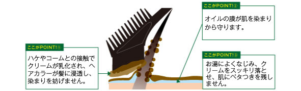 ハケやコームとの接触でクリームが乳化され、ヘアカラーが髪に浸透し、染まりを妨げません!しかもシャンプーで簡単にオフできます★