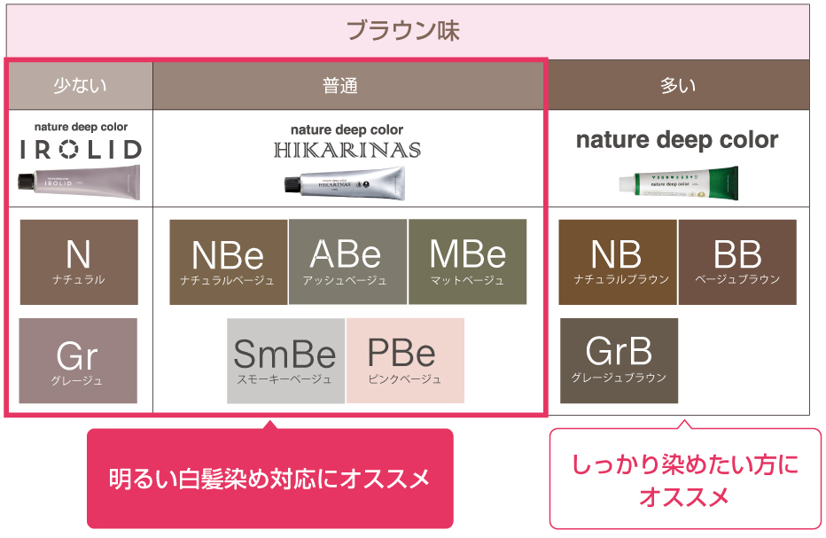 ネイチャーディープシリーズで白髪が染まる色味は下記のとおりです。