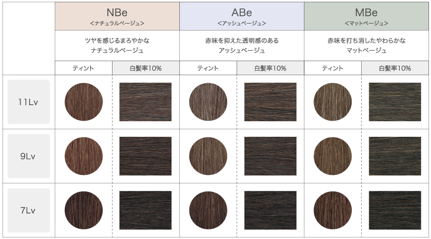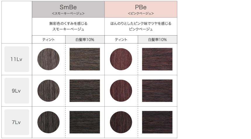 それぞれ11Lvまでラインナップしていますので、明るさ・色味を楽しむ白髪染め提案にご活用ください。
