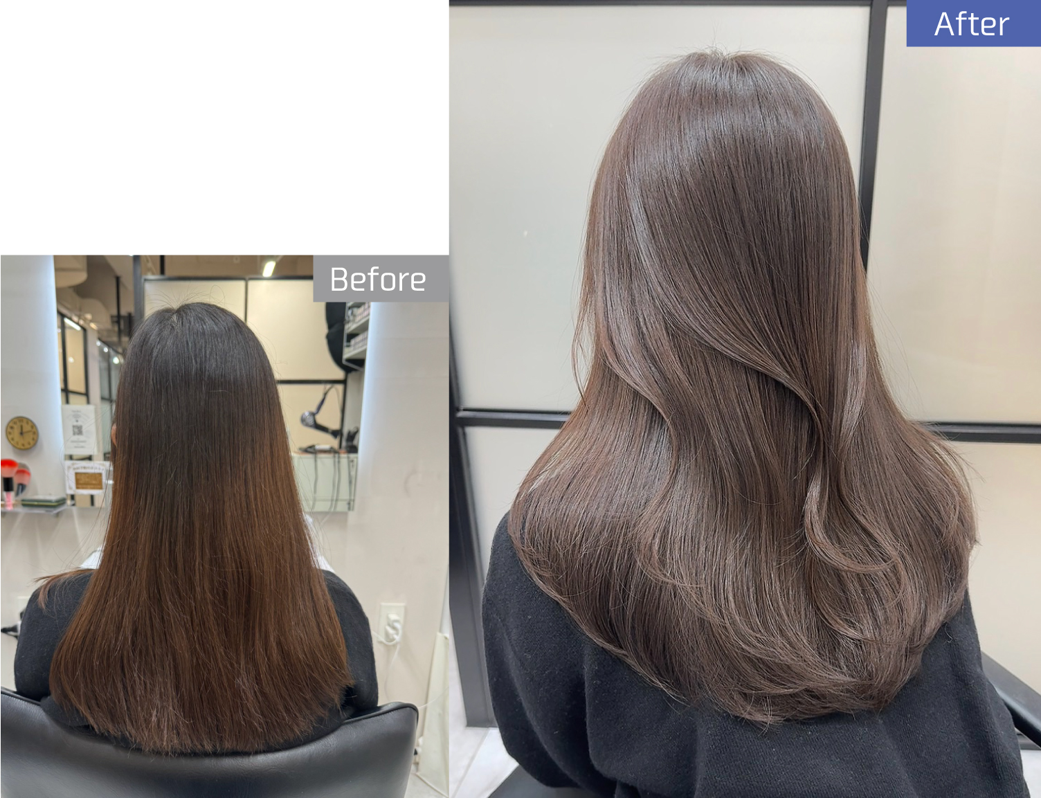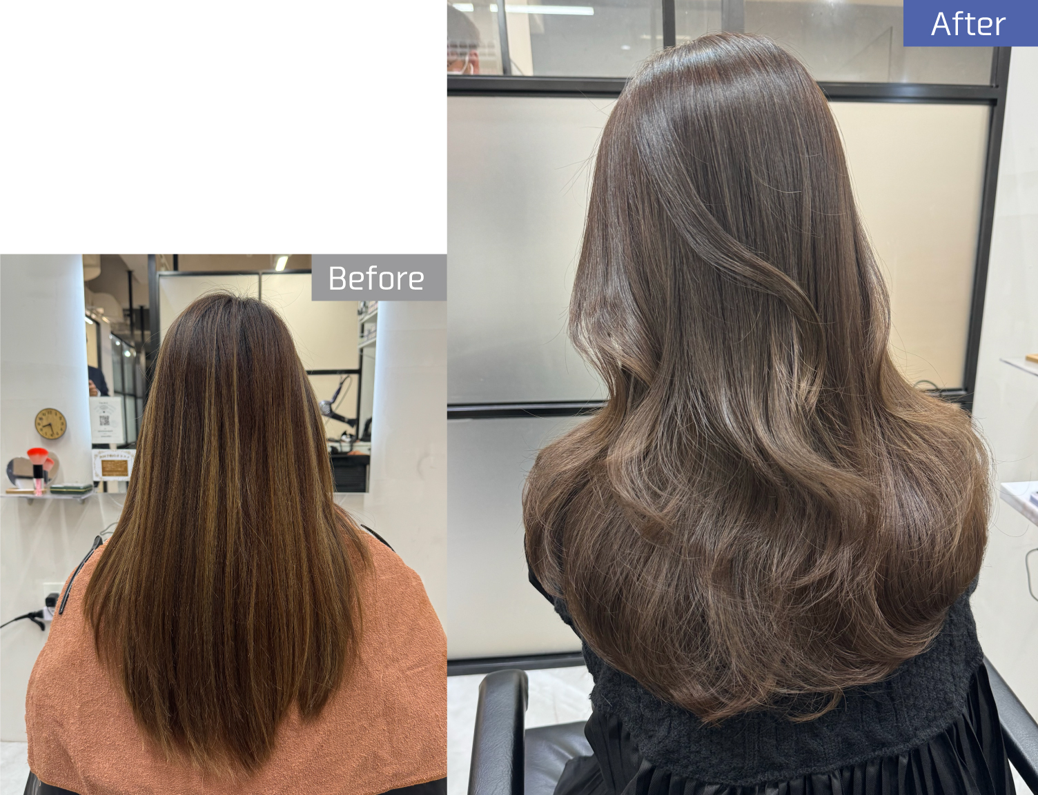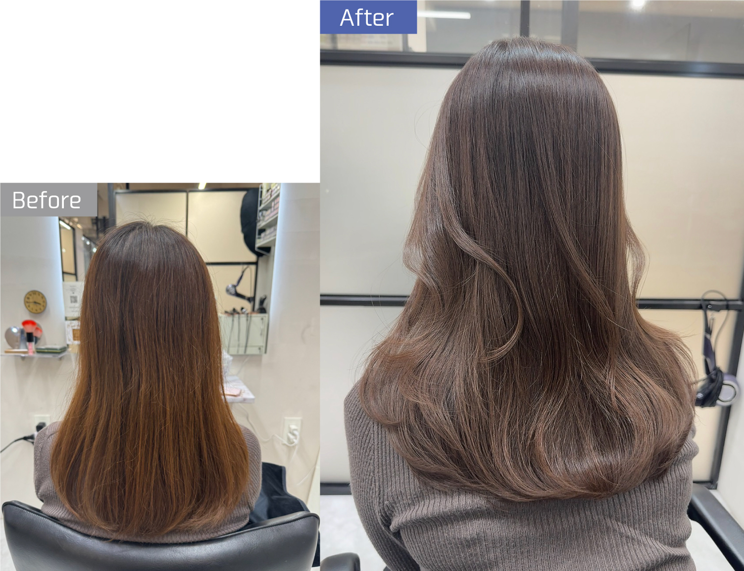 仕上がったときに根元と毛先の色味が繋がらないってことにならないように、基本的にベースになるカラー剤は根元も毛先も同じにしています。