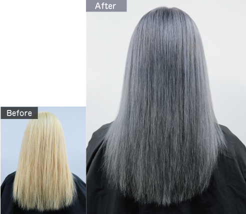 前回カラーのオレンジ味が残るハイトーンベースにワンメイクでカラー。アンダーカラーのムラを整え、グレイッシュな透け感のある仕上がりに。