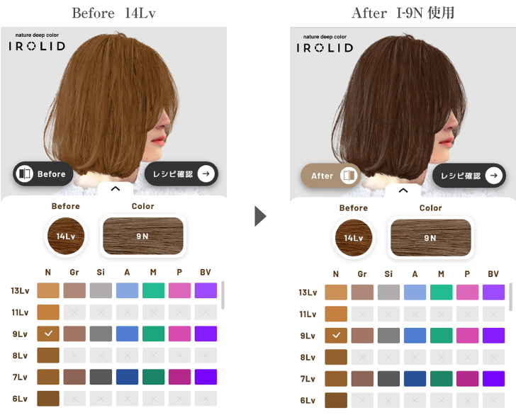 事前の髪の明るさを選択して、使用するカラーを選択すると、仕上がりの髪色が確認できます。