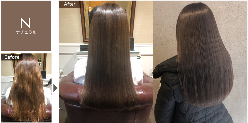 既染部にハイライトやグラデーションを活かしながら、赤味を抑えたナチュラルブラウンの色味を補給。