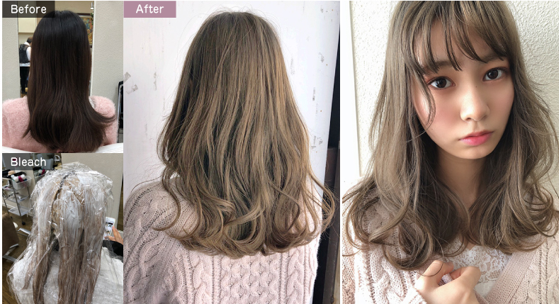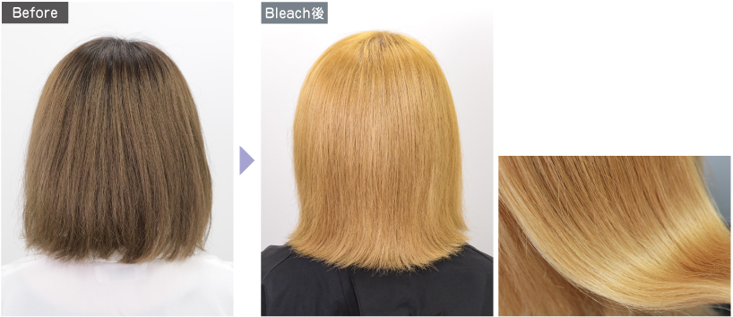 ブリーチパウダー:ヘアカラー2剤6%=1:3の比率で混合し、頭皮に付かないように塗布。希望の明るさに合わせて5~30分放置後に薬剤を完全にすすぎ流したあと、シャンプーで洗い流します。