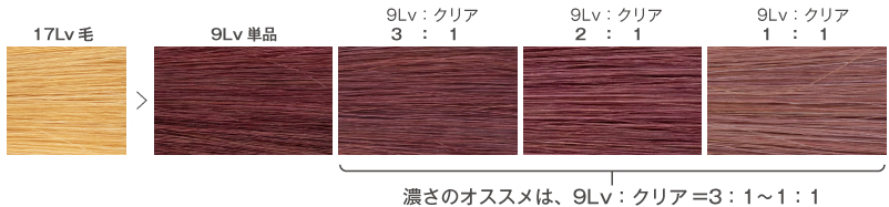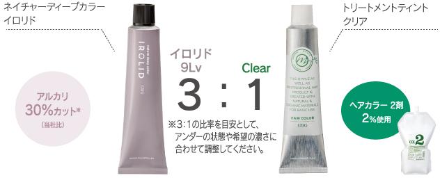 濃厚発色が特長のイロリドでは、9Lvを中心に、同じく低アルカリの『トリートメントティント クリア』で色味を薄めて、ハイトーン毛に最適な濃さに調整する方法がオススメです。トリートメントティント クリアを混ぜることで、よりダメージを抑えることができます。
