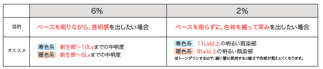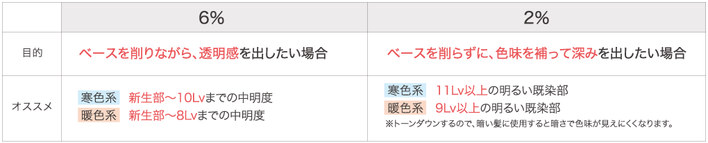 カラー前の髪の状態や、求める仕上がりで2剤をお選びください。4%は2%と6%の中間の傾向になります。