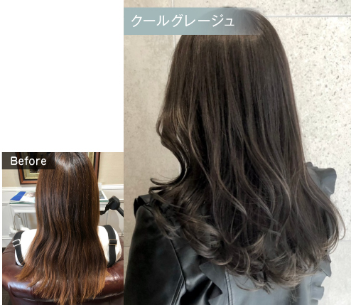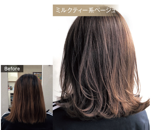 ブリーチ履歴のあるベースを活かしてさらにハイライトを入れて立体感を作り、Gr(グレージュ)とSi(シルバー)でやわらかいくすんだ色味を加えることで、ミルクティー系カラーを作りました。明るい既染部のベースにGr(グレージュ)を使うと簡単にミルクティーらしさが出るので使いやすいです。(北海道 nowインパルス 高橋さま)