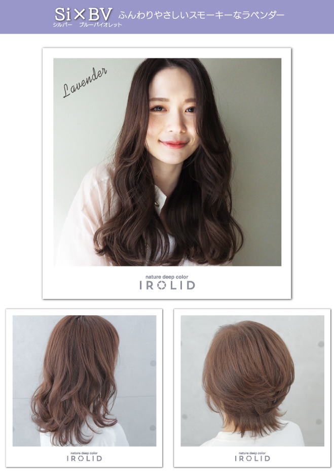 BV(ブルーバイオレット)やM(マット)の彩度をSi(シルバー)で和らげた、春らしい明るいグレイッシュトーンの色味。
